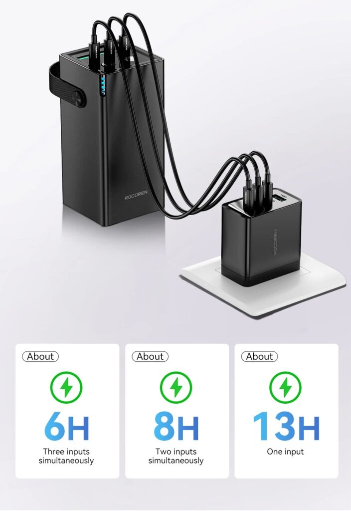 - With its high capacity, the Rocoren Power Bank can be a lifesaver during power outages or when you’re off the grid. It can keep your essential devices powered for extended periods.